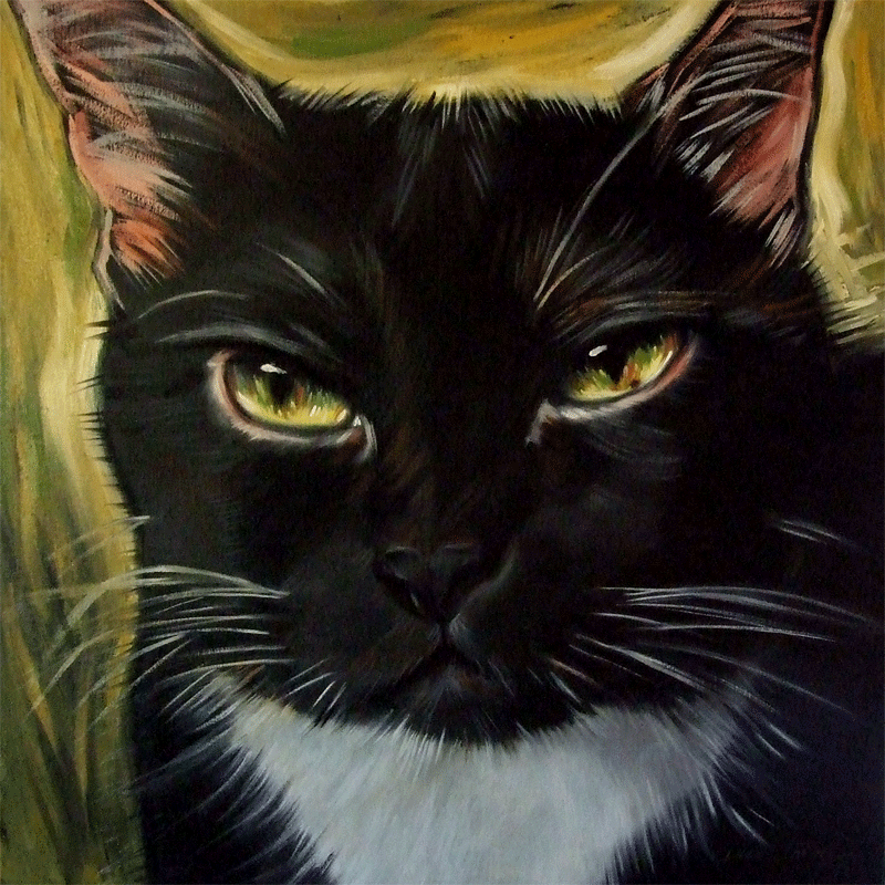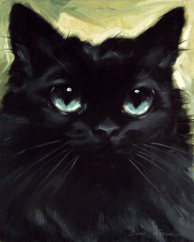 Today's painting is for Stacy, a portrait of a very lovely black cat named Annabelle. Annabelle's eyes were the most amazing color. With greens and a beautiful blue, just amazing. I very beautiful cat to paint, what a pleasure!